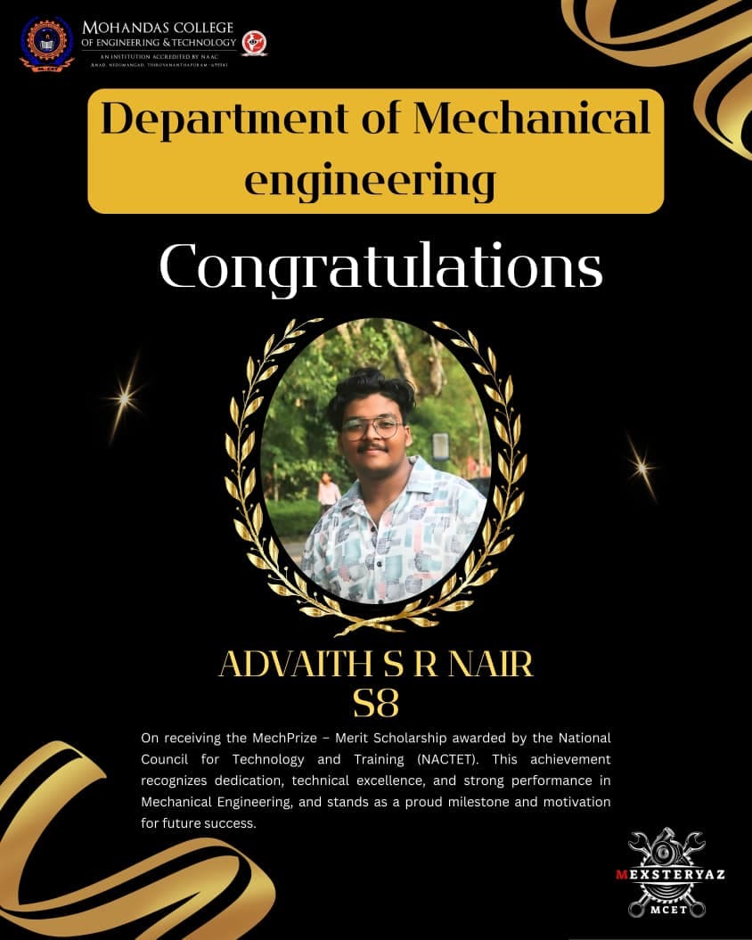 Mohandas College of Engineering and Technology is proud to announce that our students from the Department of Mechanical Engineering , Adarsh V. Suresh, Devaki Nandhana P., and Aravind Roy, have been awarded a prestigious research fund from APJ Abdul Kalam Kerala Technological University. Their project, titled “Air Jet Erosion Behaviour of High Velocity Oxygen Fuel Sprayed Tungsten Carbide-Nickel Chromium Coating on Chromium Molybdenum Steel,” is under the guidance of Principal Investigator Prof. Pradeep Raj R.